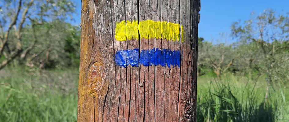 INDICAZIONI: Percorso Segnalato con Quadrati blu (percorso principale ) e Gialli (varianti) nei boschi e ambienti naturali due barre parallele giallo e blu.